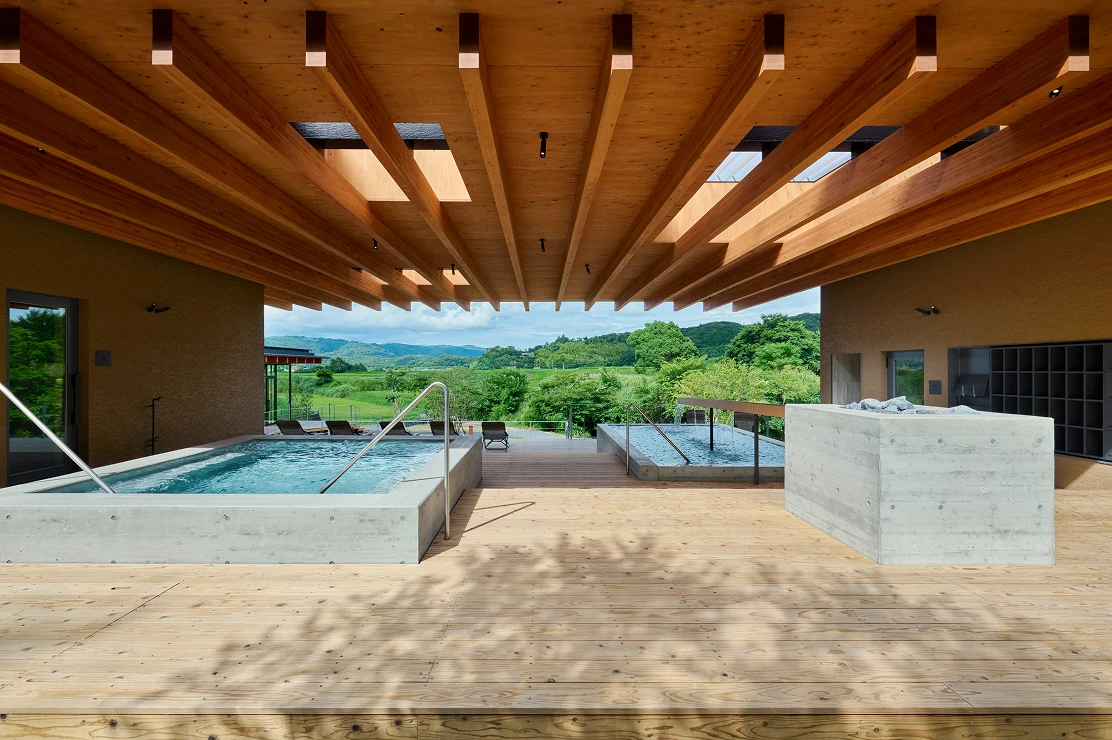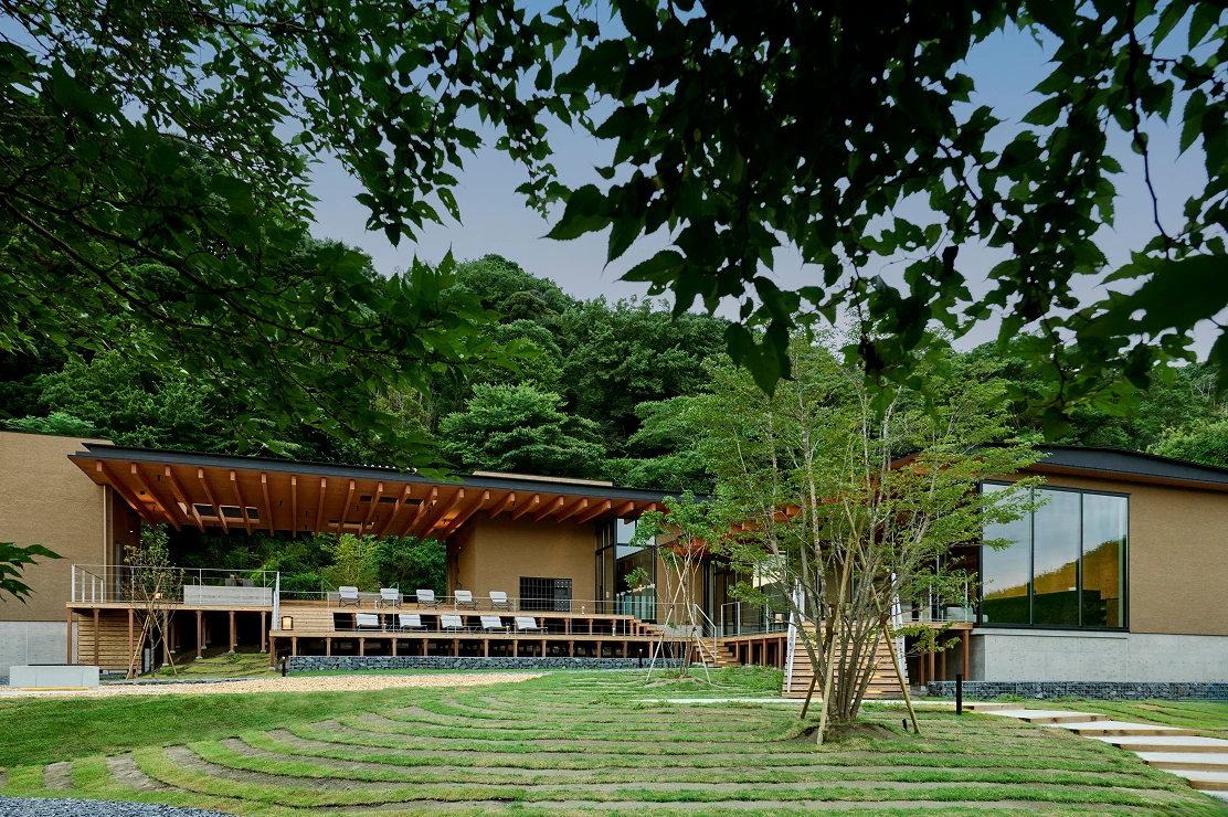 本棟のシンボルとも言える柱のない大屋根や、コンパクトな佇まいのキャビンは、この土地の風向や風速といったデータに基づいて設計されました。建築があたかも野山の一部であるかのように、自然な風の通り道として機能しています。