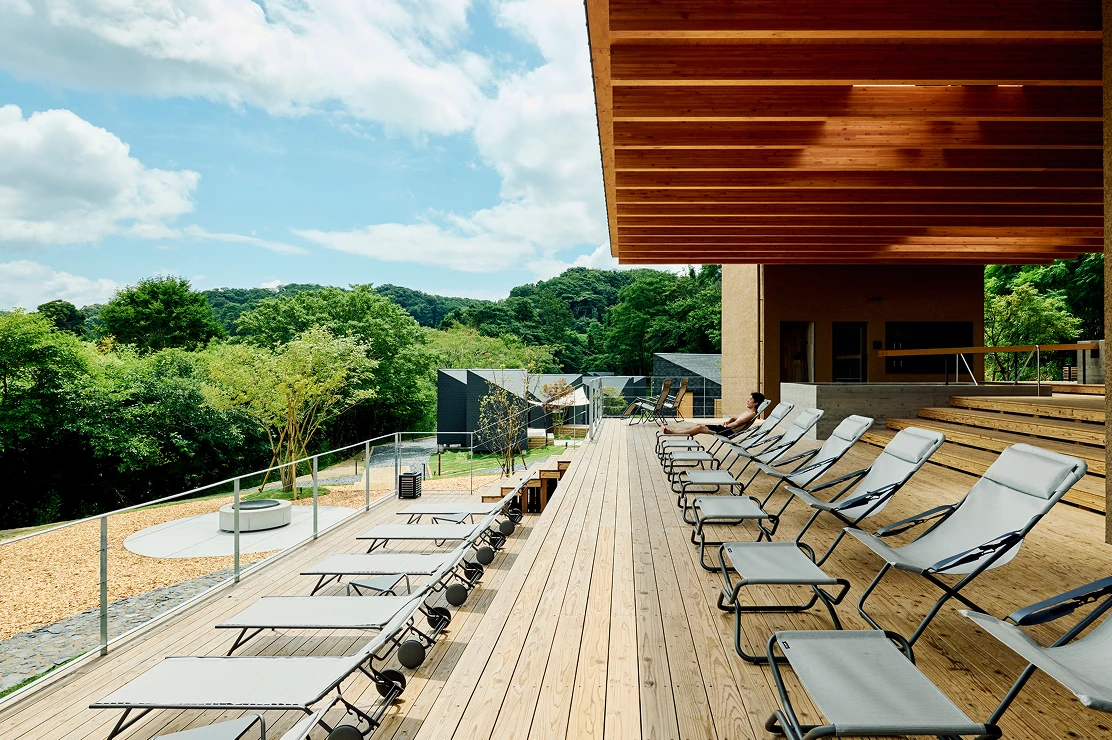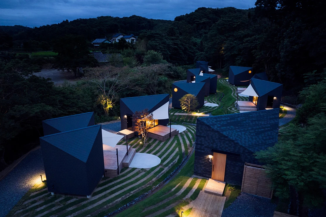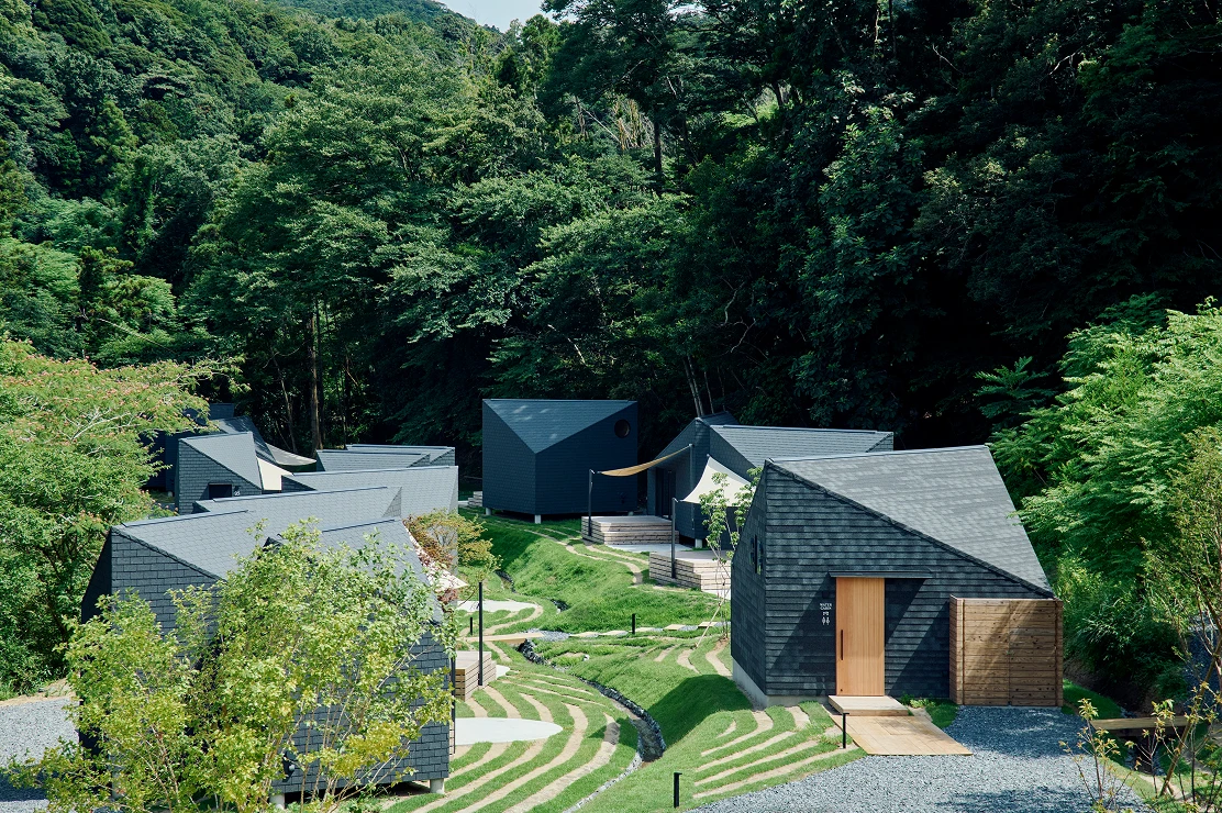サトヤマテラスは、土中の水脈を守るために、もともとの土地の形状を最大限に活かした設計となっています。本棟は斜面に寄り添って建てられ、階段の多い独特の造りに。宿泊キャビンも、昔ながらの集落のように、高低差のあるレイアウトとなりました。