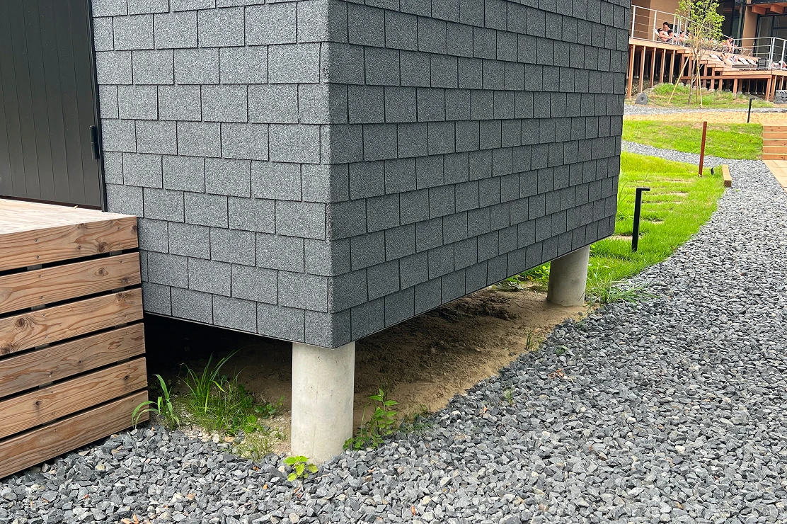 宿泊キャビンの基礎は、地面全体をコンクリートで覆うのではなく、束基礎で地面から浮かせる方法を採用。これも、大地の呼吸や水脈をそのままに守るためです。また、土地に負荷のかかる水回り設備は宿泊キャビンには置かず、一棟のウォーターキャビンにまとめました。